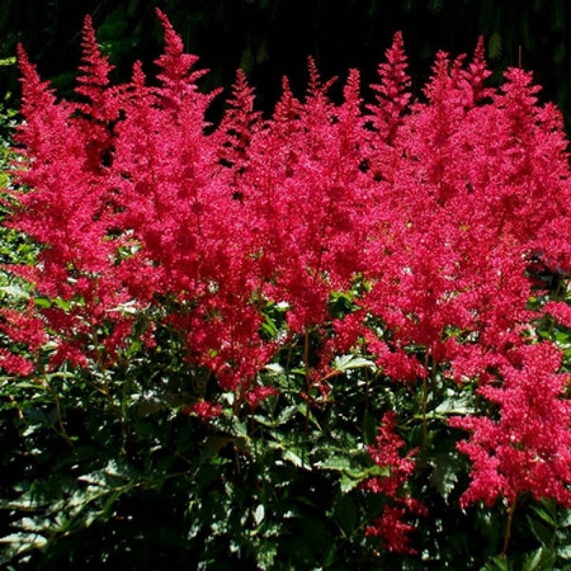 Рассада астильбы Арендса Бургунди Рэд (Burgundy Red) легко приживается и становится особенно эффектной во время цветения в массовых посадках. На зеленой листве пламенеют яркие ветвистые соцветия, усеянные множеством мелких красных звездочек. Не менее интересно наблюдать за появлением первых побегов, которые прорастают темно-красными, и затем раскрываются и зеленеют. Сорт астильбы вырастает до 70 см, ажурные побеги хорошо разрастаются в стороны. Цветоносы напоминают пушистые метелки, после периода цветения появляются коробочки с семенами. Растение хорошо переносит морозы, но в первую зиму корневища необходимо укрыть. Правильно посаженные экземпляры способны расти без пересадки много лет. Особенности посадки астильбы Бургунди Рэд: