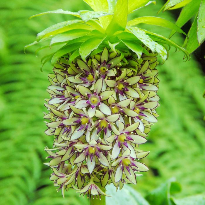Луковицы Эукомиса Осеннего Биколор (Bicolor) высаживают в просторные вазоны или в открытый грунт. Это оригинальное растение формирует пышную розетку удлиненных гладких листьев и цветоносы высотой 50 сантиметров. Соцветие цилиндрическое, состоит из множества цветков – звездочек с длинными тычинками, на макушке имеется несколько коротких листьев, напоминающих задорный хохолок. Лепестки зеленовато-кремовые, окантованы ярко-пурпурной полоской. Цветение наступает в конце августа – сентябре. Эукомис или «африканская лилия» теплолюбивое и светолюбивое растение. Его луковки необходимо отправлять на зимовку в погреб или холодильник.