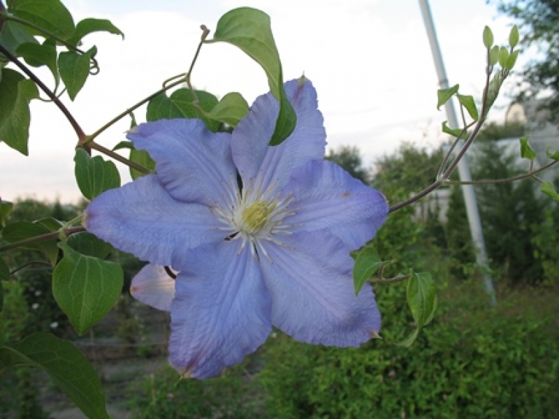Цветёт на побегах текущего года. Цветение начинается в июне и особенно сильным становится в августе. Цветки очень крупные, диаметром 15…20 см, плоские. Чашелистиков от 4 до 7, они широкоовальные с загнутым заостренным кончиком и выраженной средней полосой, на которой видны три бороздки. Окраска чашелистиков светло-сиреневая или фиолетово-голубая, средняя полоса обычно светлее. На кончике чашелистика может быть желтоватый или красноватый мазок. Тычиночные нити кремовые, пыльники светло-желтые.