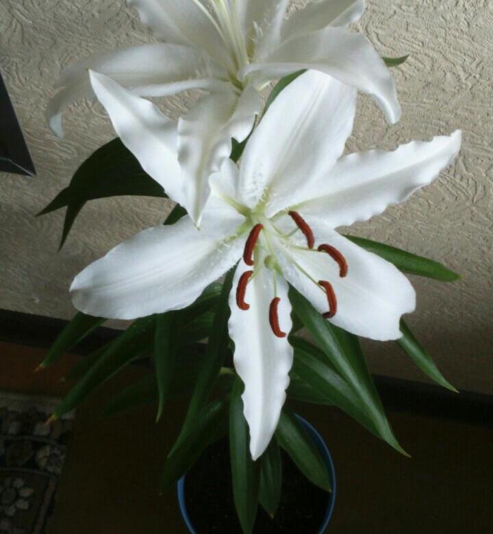 • Окраска цветка : белоснежный, насыщенно-оранжевые пыльники, лепестки волнистые по краям