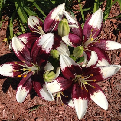 Луковицы азиатской горшечной лилии Тайни Падхай (Lilium asiatic Tiny Padhye) привлекают внимание необычным праздничным нарядом. Окраска контрастная. От центра до середины лепестков идет насыщенный винный оттенок, затем он сменяется чисто-белым цветом. Пыльники оранжевые.  Высота стеблей около 35-40 см. Цветки в диаметре до 16 см. Раскрываются полностью, изящно загибая лепестки вниз. Зацветает в июне-июле. Хорошо развивается на солнечных участках и в полутени. Любит умеренный полив. Но заливать растение не рекомендуется, луковицы могут начать гнить. Желательно высаживать на плодородных почвах.