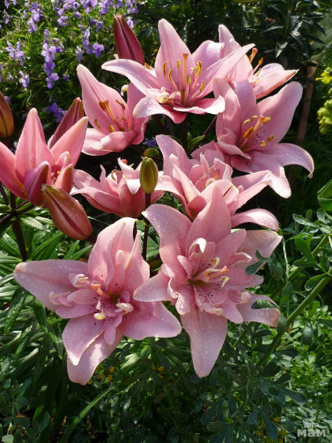 Саженцы и рассада азиатской махровой Лилии Элоди (Lilium asiatic Elodie) обязаны быть на вашем садовом участке, поскольку такие шикарные цветы приносят неимоверное удовольствие от наслаждения первозданной красотой. Представленный сорт выделяется не только объемностью своих форм, но и необычным контрастным оформлением. Нежно-розовые махровые лепестки сверху немного меньше в размерах по сравнению с нижними, чем создается эффект многоярусности. В центре крупных цветоносов с темными четкими крапинками и отогнутыми волнистыми краями, направленными вверх, располагаются шикарные тычинки. Обрезав пыльник, расположенные на них, можно продлить сроки цветения этой Лилии.