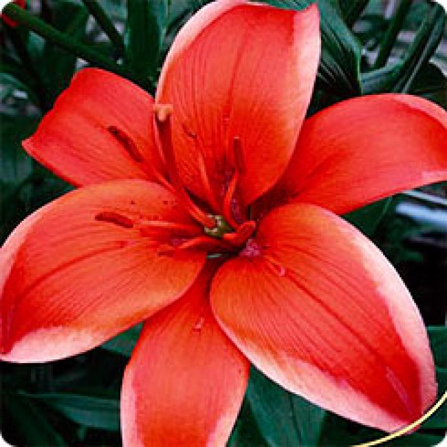 • Окраска цветка : красно-оранжевый, с широким палево-розовым кантом, лепестки загнуты вниз