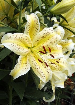 Луковицы, рассада и саженцы Лилии азиатской Йеллоу Тайгер (Lilium Yellow Tiger) выделяются среди других представителей тигровых лилий своим нежным кремово-желтым окрасом. Переход от светлого к более темному тону в виде красно-оранжевого крапа и пыльников такого же цвета придают этому сорту особый декоративный вид. Яркая «агрессивная» окраска делает Йеллоу Тайгер центральным элементом любой цветочной композиции, особенно если комбинировать посадку этой лилии с более нежными и контрастными цветами. Растение превосходно смотрится на фоне лиственных и хвойных кустарников.