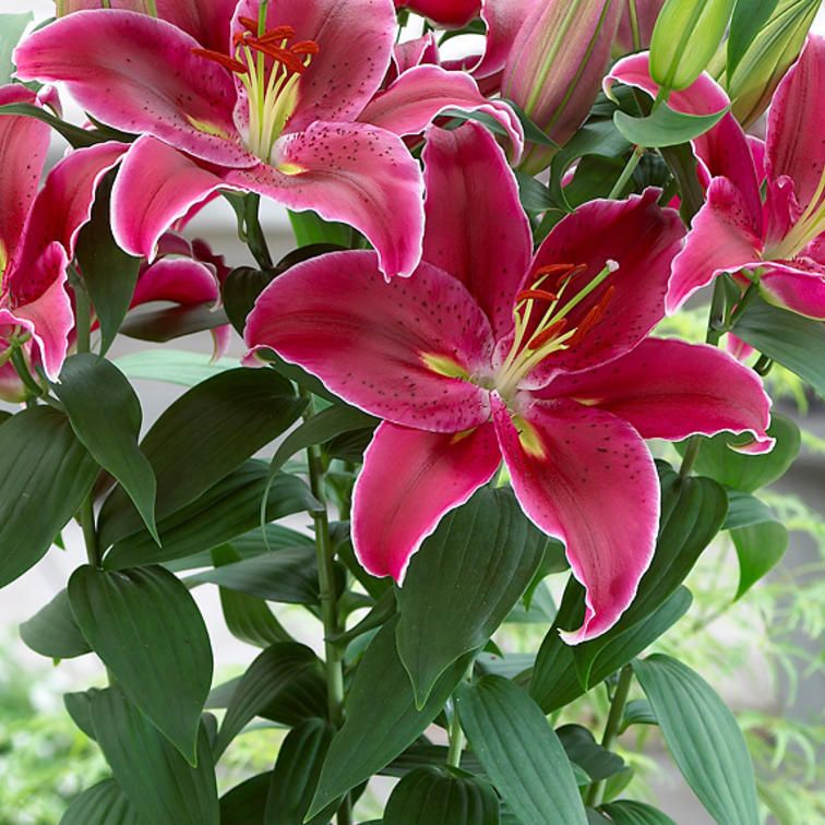 Лилия восточная Уан Лав - это изысканное растение с крупными, ярко-малиновыми цветками, украшенными темно-малиновым крапом. Ее высота может достигать до 110 см, а размер цветка поражает воображение - до 25 см! Листья лилии имеют интересную форму, что делает это растение еще более привлекательным для глаз.