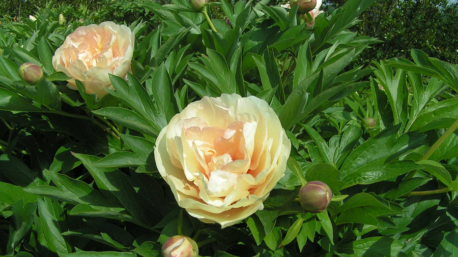 Рассада пиона ИТО Кенари Бриллиантс (Canary Brilliants), не доставит хлопот садоводу и превратится в декоративные кусты с очаровательными кудрявыми цветами. Взрослое растение – раскидистый, но компактный куст, не выше 1 м. Окраска цветов переливается оттенками от лососевого до персикового. Листва посеченная, темно-зеленая. Прочные побеги хорошо удерживают пышные соцветия. Основание ствола покрывается древесной корой. Особенности посадки пиона Кенари Бриллиантс: